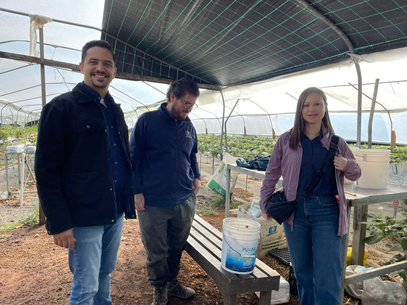 Durante la jornada del 3 de febrero, el equipo de investigación visitó la Finca familiar San José, productora de fresa ubicada en Poás de Alajuela, donde se dialogó con el productor sobre los retos productivos y el manejo de subproductos. En este espacio se identificó el potencial de tallos, hojas y fruta de descarte como materias primas para el desarrollo de nanofertilizantes, revalorizando esta biomasa que tradicionalmente se utiliza como residuo.