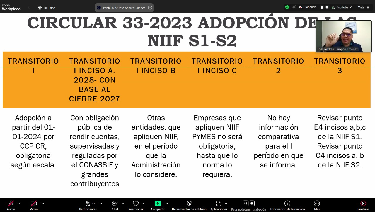 La carrera de Contabilidad y Finanzas Contaduría Pública realizó el 27 de noviembre 2025 la charla virtual “NIIF S1 y S2: De la teoría a una aplicación práctica”. La actividad se transmitió por la plataforma Zoom, fue organizada por el grupo 2 del curso de Normativa Contable a cargo del docente Jhonathan Quirós Maroto y contó con el mensaje de bienvenida del señor Henry Alvarado Chavarría, Director de la Carrera. La ponencia estuvo a cargo del docente José Andrés Campos, quien presentó ejemplos concretos sobre la implementación de las normas internacionales de información financiera relacionadas con sostenibilidad.