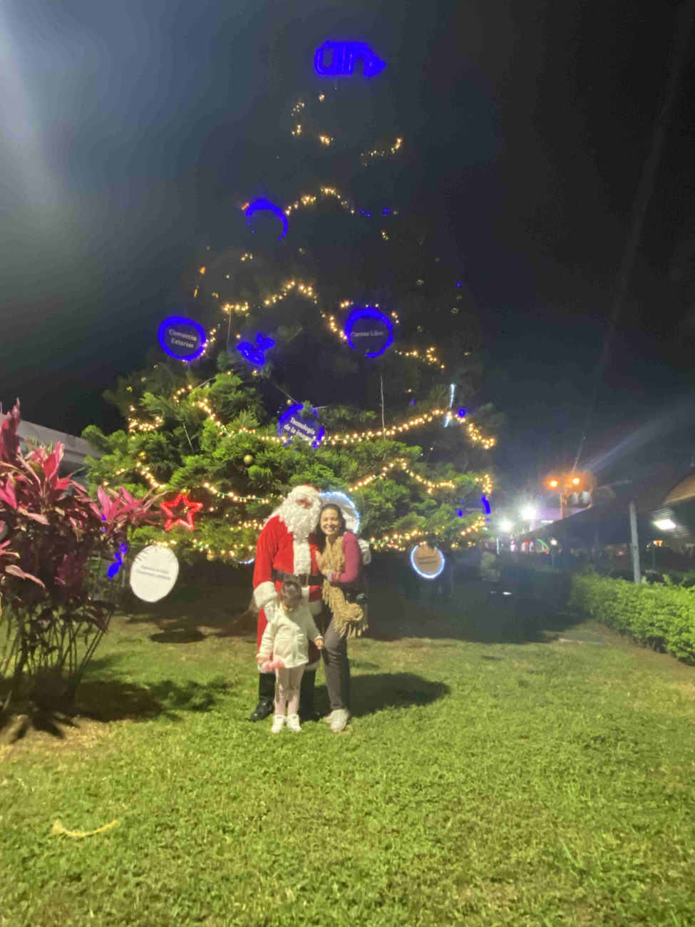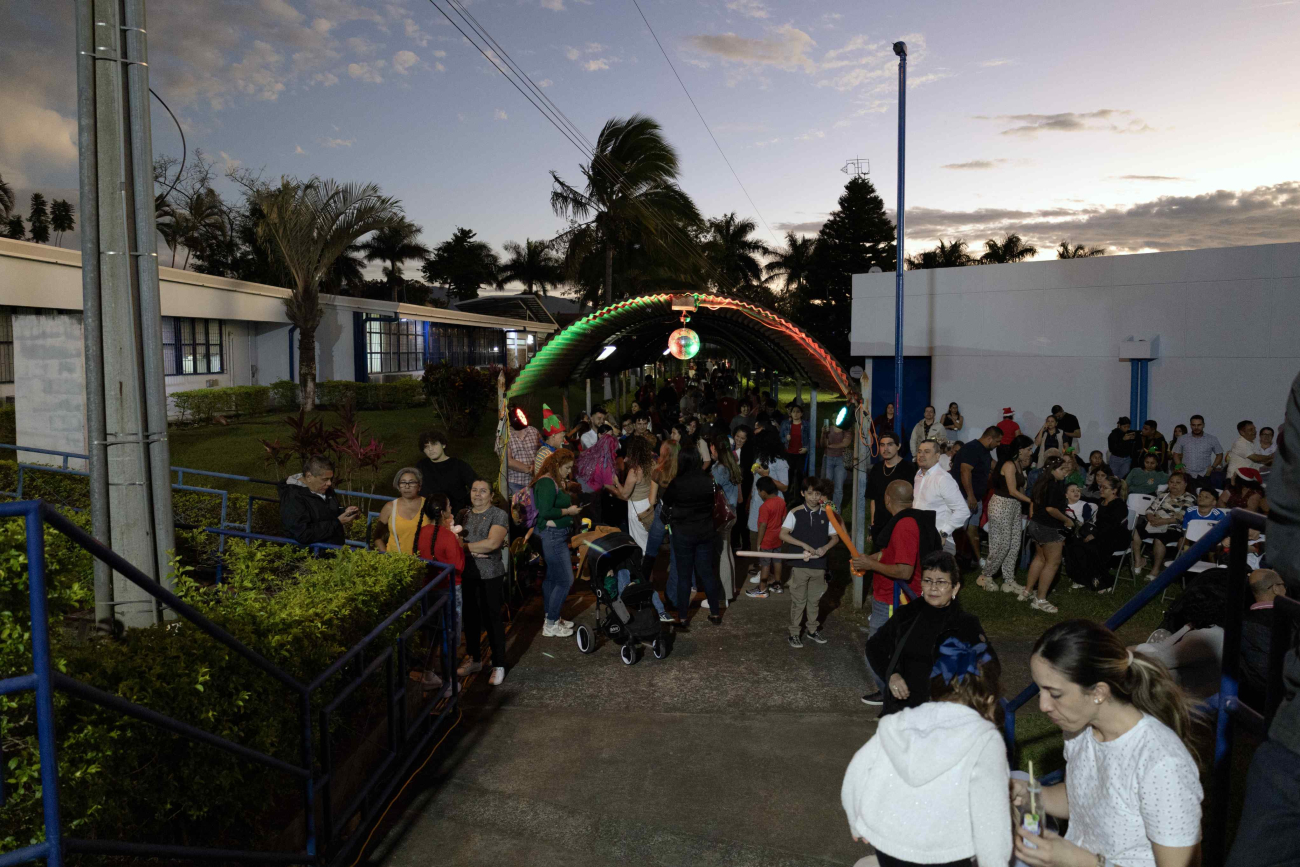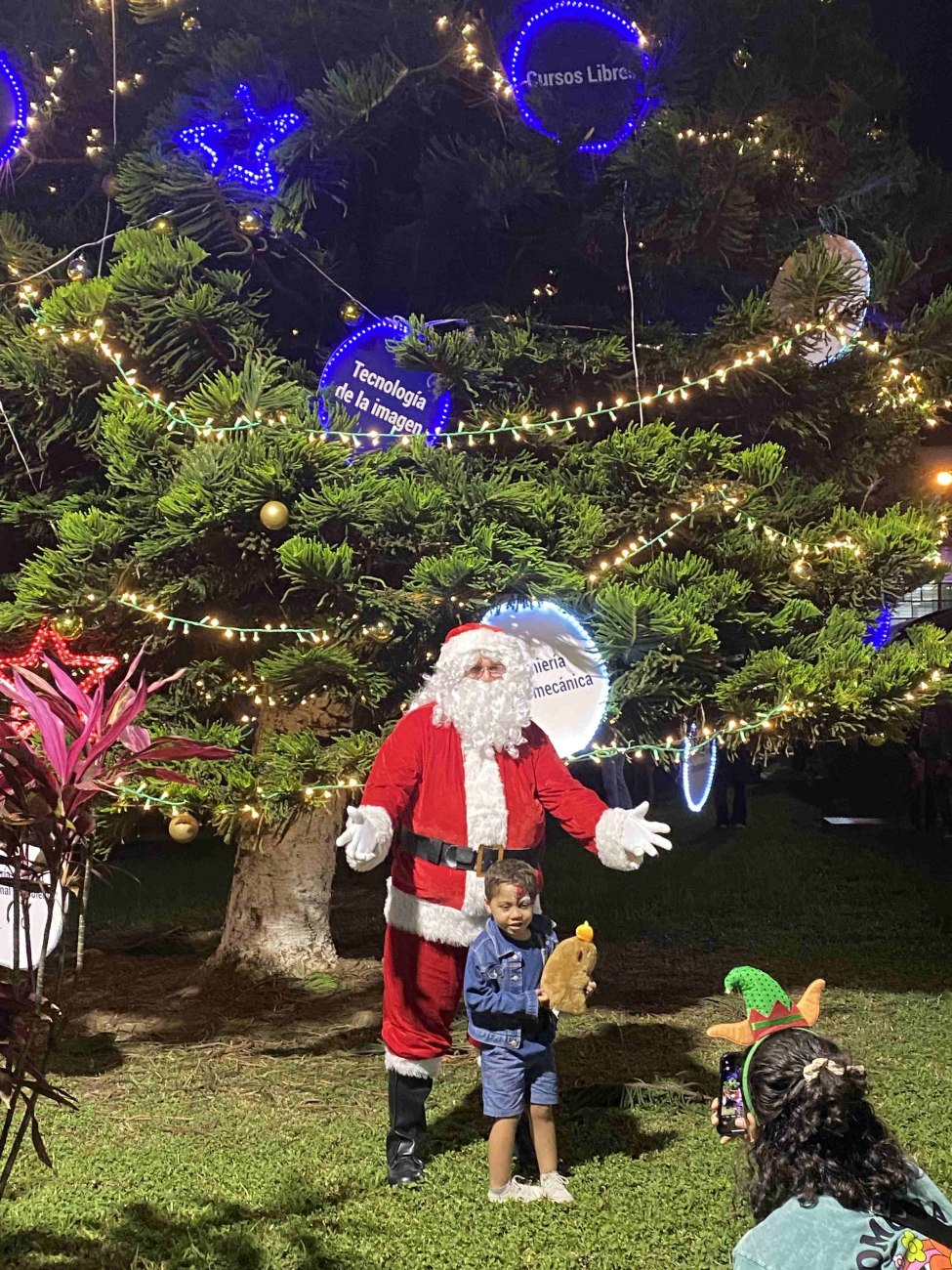 Uno de los momentos más esperados y emotivos fue la llegada de un invitado muy especial: Santa Claus, quien fue recibido entre aplausos y alegría por parte de niños y adultos. Minutos más tarde, acompañó a la comunidad en el acto más simbólico de la jornada: la iluminación del árbol navideño de la Sede Central. Con una cuenta regresiva llena de emoción, el campus se iluminó, dando paso a un ambiente de esperanza, unidad y magia navideña.
