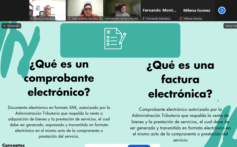 El 20 de marzo de 2026 la carrera COFI-CP desarrolló una capacitación virtual especializada sobre facturación electrónica, dirigida a estudiantes de la carrera, docentes, egresados y público en general, con el propósito de fortalecer conocimientos en materia tributaria y el uso de herramientas digitales. La actividad contó con la participación de los expositores José Andrés Campos Jiménez y Emmanuel Campos Acuña, egresados de la carrera COFI-CP, quienes compartieron su experiencia y conocimientos en torno a la implementación, uso y cumplimiento de la facturación electrónica en el contexto nacional.