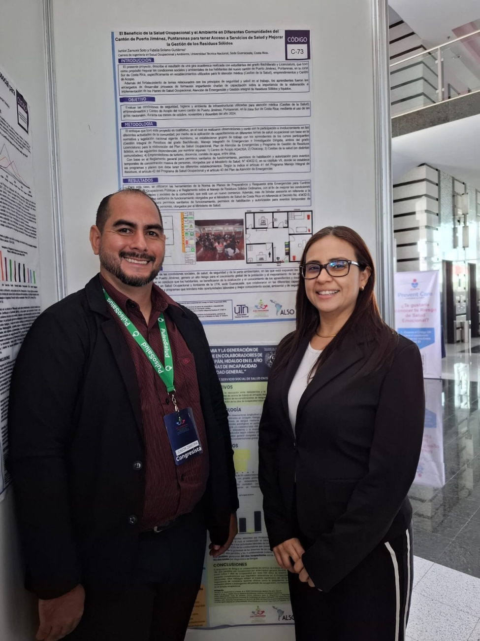 Asimismo, los docentes Junior Zamora (autor) y Fidelia Solano (coautora) participaron con la ponencia “El beneficio de la Salud Ocupacional y el Ambiente en diferentes comunidades del cantón de Puerto Jiménez, Puntarenas, para tener acceso a servicios de salud y mejorar la gestión de los residuos sólidos”. Este trabajo se centró en infraestructuras comunitarias como las Casitas de la Salud, emprendimientos locales y un centro de acopio, donde se desarrollaron procesos de capacitación en gestión de residuos sólidos, planes de atención de emergencias y salud ocupacional.