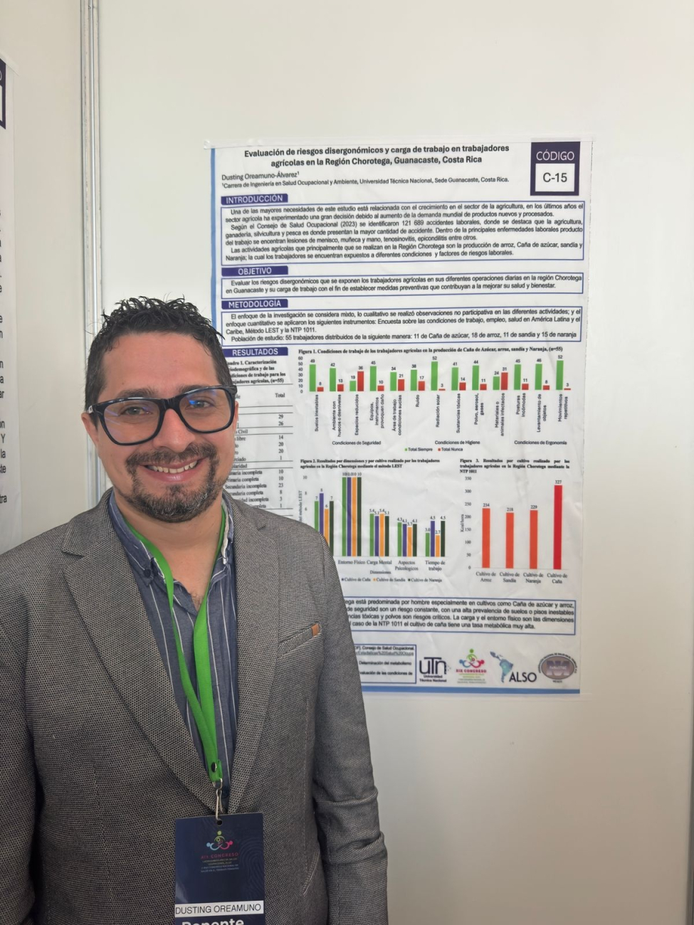 El docente de la carrera de Ingeniería en Salud Ocupacional y Ambiente (ISOA), Dusting Oreamuno, presentó el cartel titulado “Evaluación de riesgos disergonómicos y carga de trabajo en trabajadores agrícolas en la Región Chorotega, Costa Rica”. Este estudio aborda los riesgos de seguridad y salud en trabajadores de los sectores de caña de azúcar, arroz, sandía y naranja, evaluando la exposición a diversas condiciones ocupacionales. La investigación resalta la necesidad de mejorar la ergonomía, reducir las cargas físicas y fortalecer las medidas de protección ambiental, evidenciando una alta prevalencia de dolor lumbar y otros trastornos musculoesqueléticos en este sector productivo.