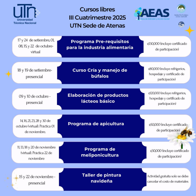 La Sede de Atenas impartirá durante el III cuatrimestre, varios cursos relacionados con la industria alimentaria, ganadería bufalina, apicultura y pintura navideña dirigidos a una diversidad de públicos.