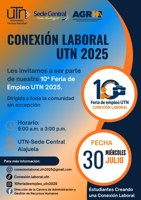 Los estudiantes del curso Reclutamiento y Selección de la Carrera de Administración y Gestión de Recursos Humanos de la UTN realizarán el 30 de julio, la Feria de Empleo Conexión Laboral 2025 en las instalaciones de la Sede Central de la universidad, ubicadas en Villa Bonita de Alajuela.