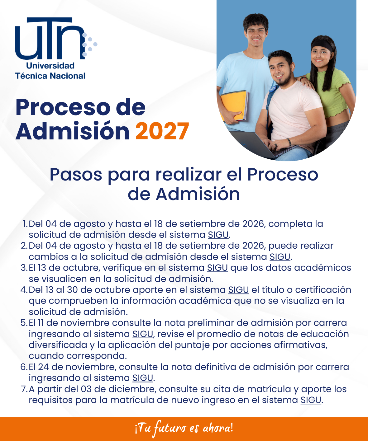 La solicitud de admisión, para ingresar en el 2027, se realiza del 4 de agosto al 18 de setiembre de 2026. Puede acceder en el siguiente enlace al sistema SIGU para completar la solicitud de admisión.