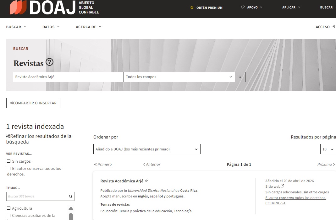 La Revista Académica Arjé (UTN) ha sido oficialmente indexada en el Directory of Open Access Journals (DOAJ) una de las bases de datos más prestigiosas a nivel mundial en el ámbito del acceso abierto